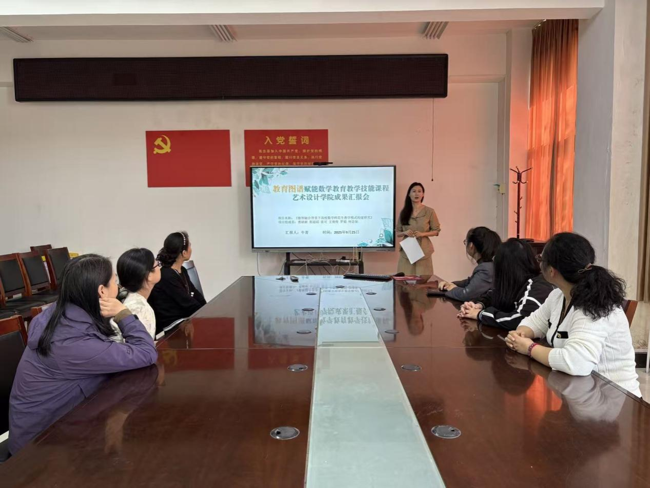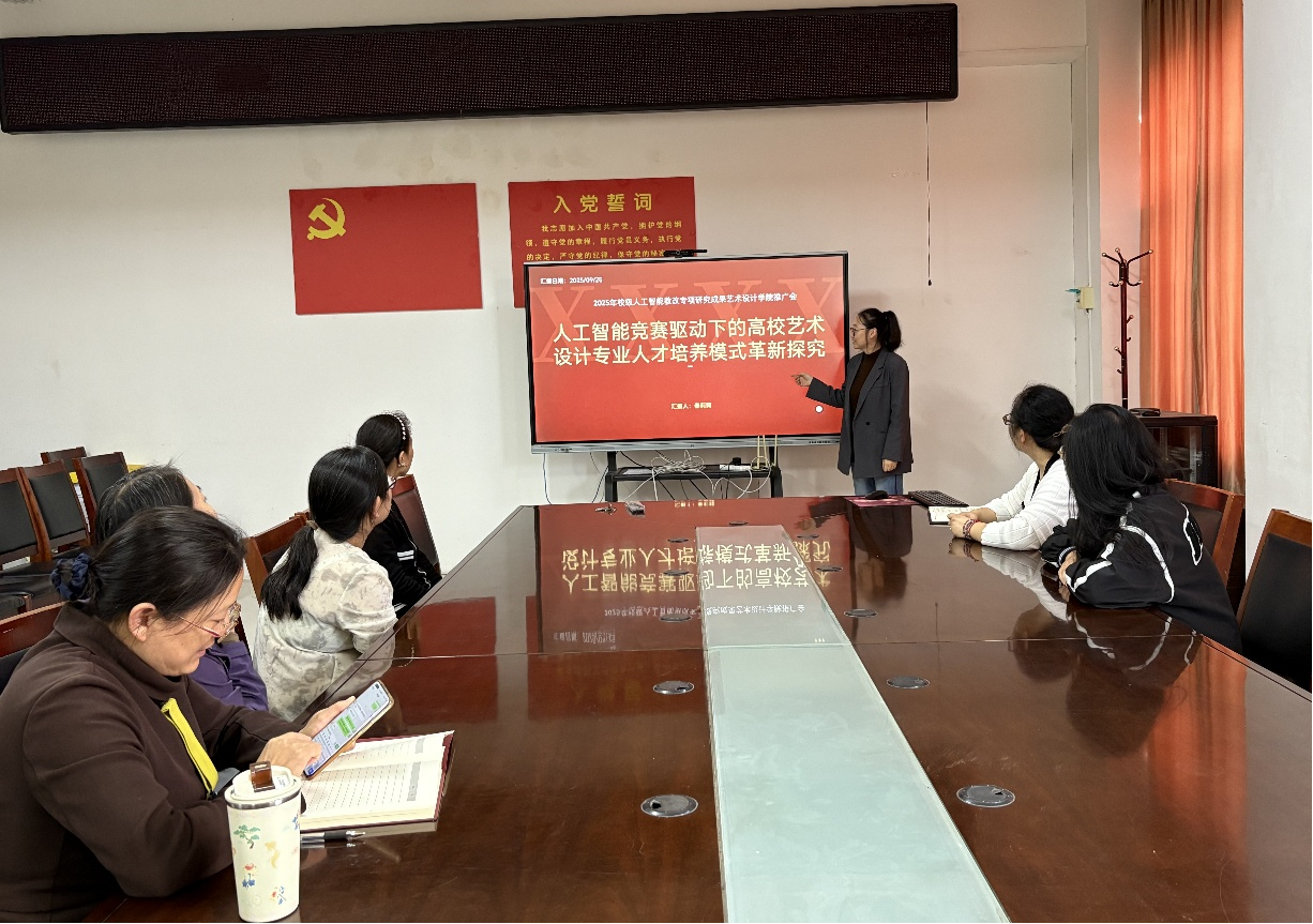 汇报会上,秦莉莉老师的“人工智能竞赛驱动下的高校艺术设计专业人才培养模式革新”校级教改项目系统阐述了项目背景、实施路径与创新成效。为回应人工智能时代的深刻变革,项目致力于破解传统艺术设计教育的三大痛点:推动跨学科融合,以消解专业界限;升级课程体系,以对接技术前沿;深化产教融合,以弥合实践落差。项目提出以“竞赛驱动、跨学科融合、校企协同”为核心思路,构建了“竞赛—课程—平台—评价”四轴联动的闭环培养模型,推动学生创新能力、技术能力与商业能力螺旋式提升。
