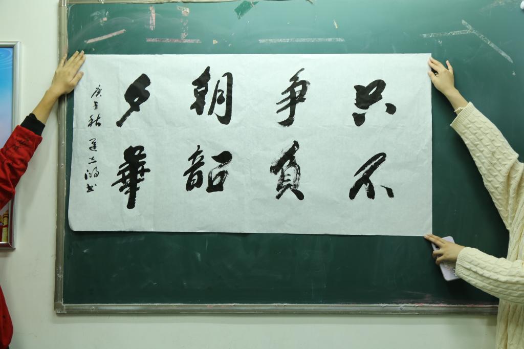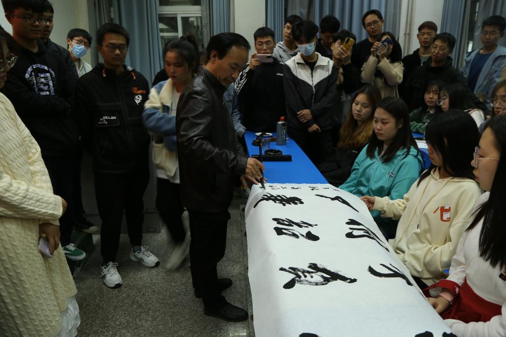 首先,迟书记结合自身经验为同学们讲解了书法的书写特点并分享自己的学习心得。同时告诉同学们通过学习书法,可以养成细致、专注、沉着的学习品质。随后,迟书记系统地讲解了“提、按、顿、挫”四种书写技法及笔法的关系。最后,迟书记亲自为同学们写下“只争朝夕,不负韶华”“学书养志”等书法作品,以此来勉励大家更好的学习和传承书法文化。迟书记以独到的见解、生动的示范,让现场书法爱好者受益匪浅。