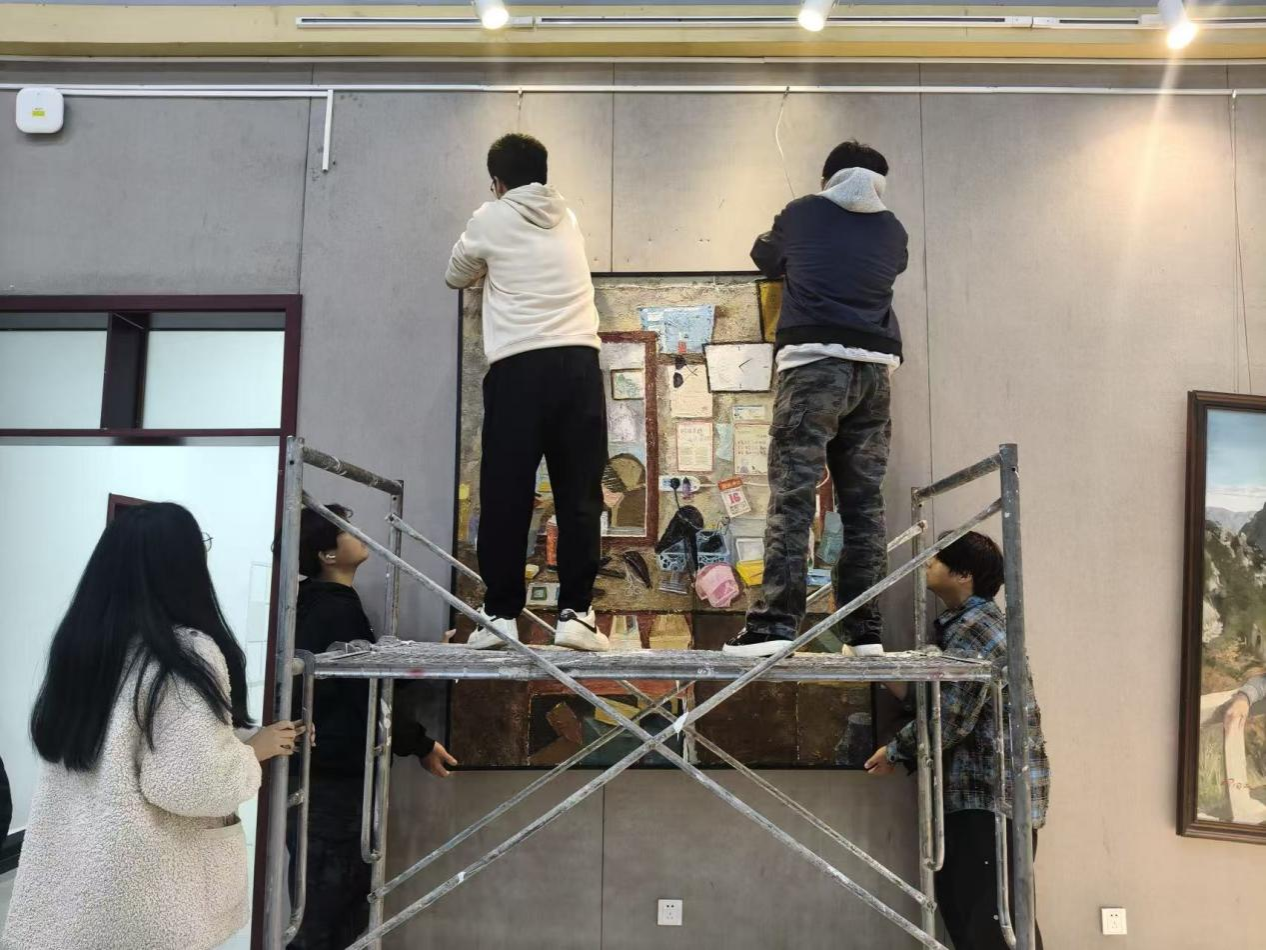 在活动中,同学们主动承担起挂画的主力工作,小心翼翼地搬运着国画和油画作品。“画境搬运工”并非简单的体力劳动,而是一次沉浸式的艺术实践,从画作搬运、挂钩安装到作品上墙,每一个步骤都凝聚着团结协作精神与艺术热情。师生之间的分工协作,不仅提高了效率,而且培养了大家的责任意识与团队精神。